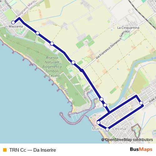 The first stop of the TRN Cc bus route is Hotel Villa Mazzanta and the last stop is Hotel Villa Mazzanta. TRN Cc (Da Inserire) is operational during everyday.