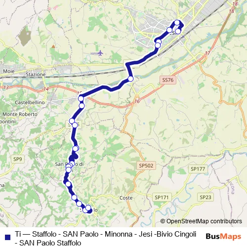 The first stop of the Ti bus route is Jesi (Capolinea) and the last stop is Staffolo (Centro). Ti (Staffolo - SAN Paolo - Minonna - Jesi -Bivio Cingoli - SAN Paolo Staffolo) is operational during everyday.