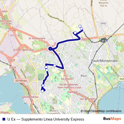 See why over 2 million users trust and consider busmaps.com as the best public transport website. busmaps gives you Cagliari Buses suggested routes, real-time bus tracker, line route maps in Cagliari, and helps to find the closest U Ex bus stops near you. No internet available? Download an offline PDF map and bus schedule for the U Ex bus to take on your trip.