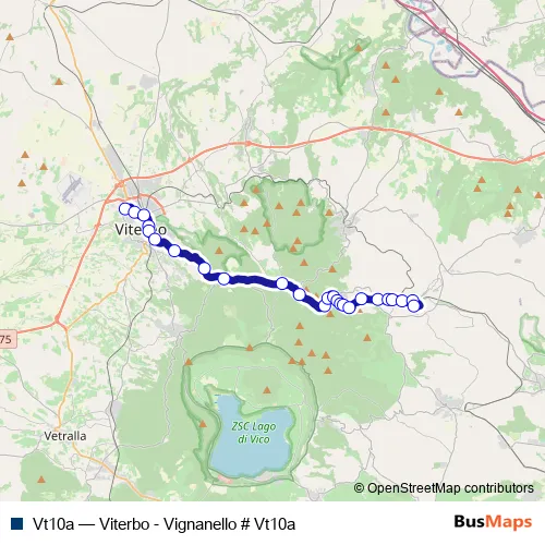 The first stop of the Vt10a bus route is Viterbo | Riello # f641 and the last stop is Vignanello | Talano # f00086. Vt10a (Viterbo - Vignanello # Vt10a) is operational during everyday.