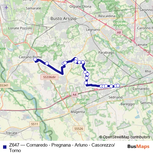 The first stop of the Z647 bus route is Castano Primo, Don Milani and the last stop is Arluno, S. Francesco. Z647 (Cornaredo - Pregnana - Arluno - Casorezzo/Torno) is operational during on weekdays.
