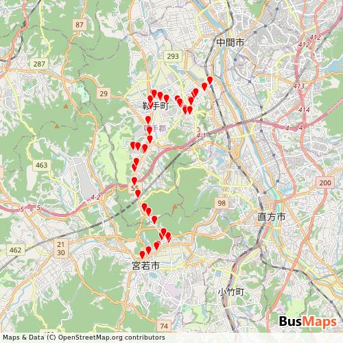 Transit map showing kuratetownsmilebusmiyawakaline routes and stops in Japan