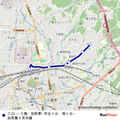 The first stop of the 三33 bus route is Kamo-chuo and the last stop is Mishimaeki-kitaguchi. 三33 (Mishima Sta.-Fujimidai) is operational during everyday.