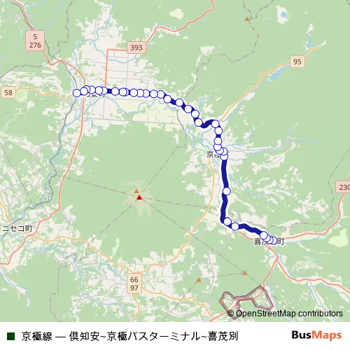The first stop of the 京極線 bus route is 喜茂別 and the last stop is 倶知安駅前. 京極線 (倶知安~京極バスターミナル~喜茂別) is operational during everyday.
