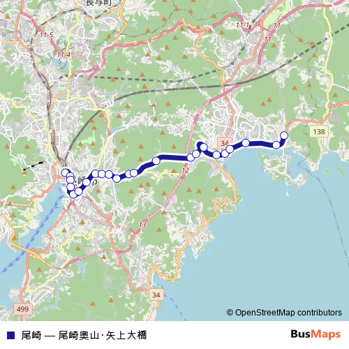 The first stop of the 尾崎 bus route is Nagasaki Ekimae(Nagasaki Sta.) and the last stop is Ozaki Toishi. 尾崎 (尾崎奥山・矢上大橋) is operational during on weekdays.