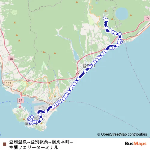 Additional information: 登別温泉→登別駅前→幌別本町→室蘭フェリーターミナル has 58 stops and the total trip duration for this route is approximately 97 minutes.