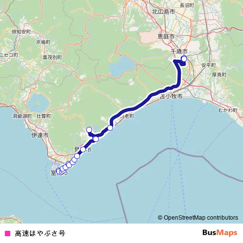 The first stop of the 高速はやぶさ号 bus route is 室蘭観光協会前 and the last stop is 新千歳空港国内線2番のりば. 高速はやぶさ号 is operational during everyday.