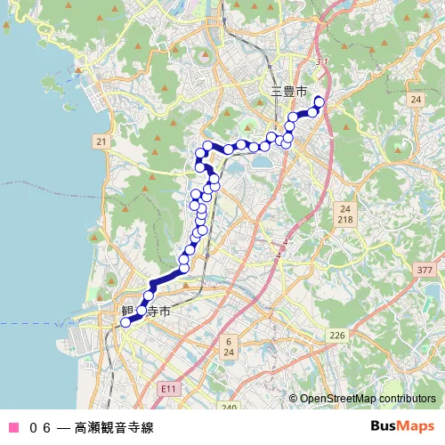The first stop of the 06 bus route is Kan-onji-Eki and the last stop is Takase-Tennen-Onsen. 06 (Takase-Kan-onji Line) is operational during everyday.