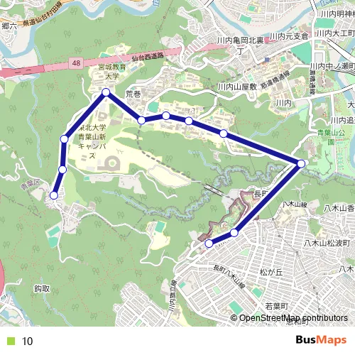 The first stop of the 10 bus route is Aobadai and the last stop is Yagiyama Dobutsu Koen Eki (Yagiyama Zoological Park Station). 10 is operational during everyday.