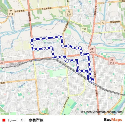 The first stop of the 13 bus route is Obihiro-eki Bus Terminal(Obihiro Sta.) and the last stop is Obihiro-eki Bus Terminal(Obihiro Sta.). 13 (一中・療養所線) is operational during on weekdays.