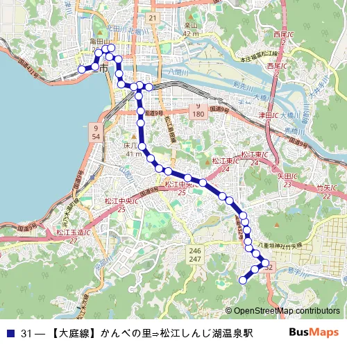 The first stop of the 31 bus route is Kanbe-no-Sato and the last stop is Matsue Shinjiko Onsen Station. 31 (Oba Line (Kanbe no Sato ⇒ Matsue Shinjiko Onsen Station)) is operational during everyday.