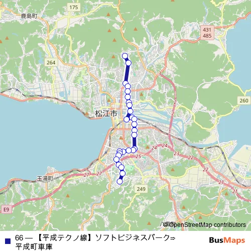 The first stop of the 66 bus route is Techno-Arc Shimane and the last stop is Heisei-cho Bus Garage. 66 (Heisei Techno Line (Soft Business Park ⇒ Heisei-cho Depot)) is operational during everyday.