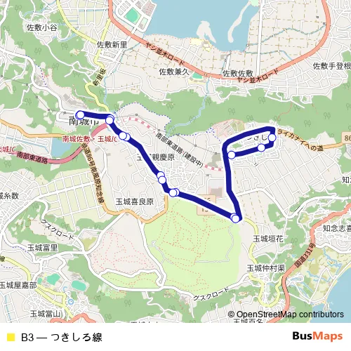 The first stop of the B3 bus route is Nanjo Shiyakusho(Nanjo City Office) and the last stop is Nanjo Shiyakusho(Nanjo City Office). B3 (Tsukishiro line) is operational during on weekdays.