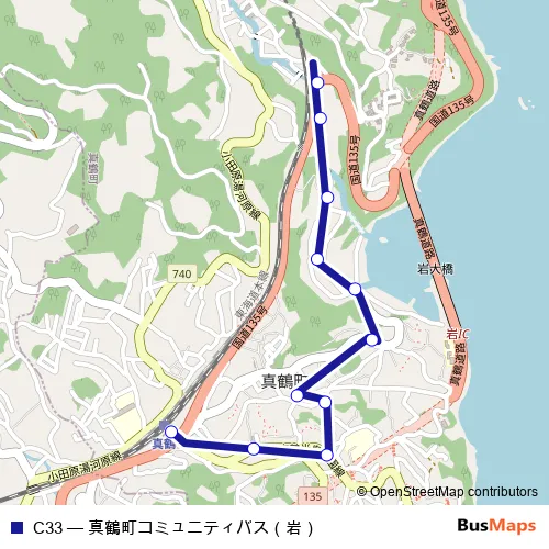 The first stop of the C33 bus route is Iwa and the last stop is Manazuru Sta.. C33 (Manazuru Sta-Ishinazaka-Iwa-Chomin-center-Manazuru Sta) is operational during on weekdays.