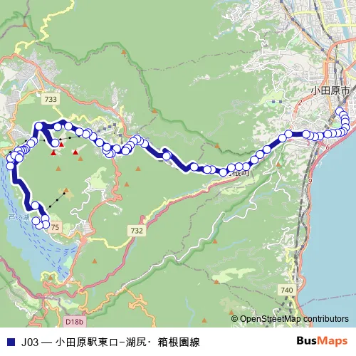 The first stop of the J03 bus route is Odawara Sta. and the last stop is Hakone-en. J03 (J Odawara Sta.-Owakudani-Hakone-en) is operational during everyday.