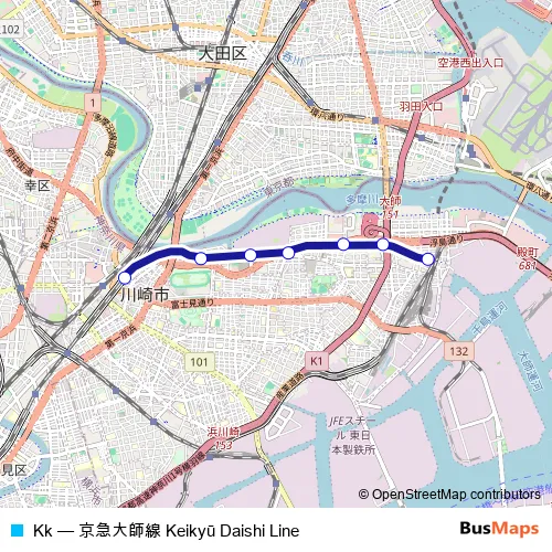 The first stop of the Kk rail route is Keikyū Kawasaki and the last stop is Kojimashinden. Kk (Keikyū Daishi Line) is operational during everyday.