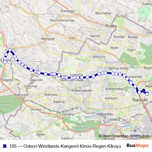 The first stop of the 105 bus route is Kikuyu Terminus and the last stop is Odeon. 105 (Odeon-Westlands-Kangemi-Kinoo-Regen-Kikuyu) is operational during everyday.