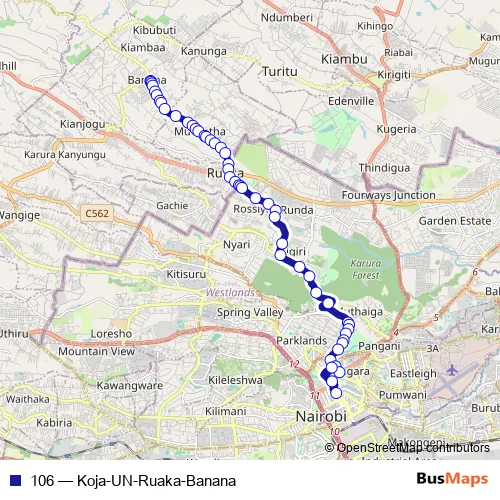 See why over 2 million users trust and consider busmaps.com as the best public transport website. busmaps gives you Nairobi Buses suggested routes, real-time bus tracker, line route maps in Nairobi, and helps to find the closest 106 bus stops near you. No internet available? Download an offline PDF map and bus schedule for the 106 bus to take on your trip.