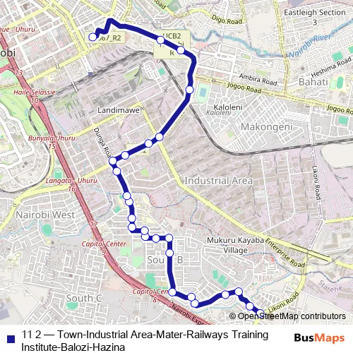 The first stop of the 11 2 bus route is Winners and the last stop is Bus Station. 11 2 (Town-Industrial Area-Mater-Railways Training Institute-Balozi-Hazina) is operational during everyday.