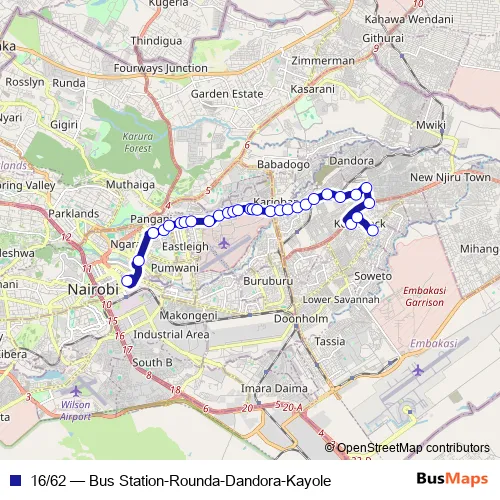 See why over 2 million users trust and consider busmaps.com as the best public transport website. busmaps gives you Nairobi Buses suggested routes, real-time bus tracker, line route maps in Nairobi, and helps to find the closest 16/62 bus stops near you. No internet available? Download an offline PDF map and bus schedule for the 16/62 bus to take on your trip.
