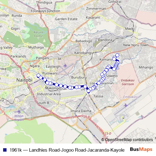 See why over 2 million users trust and consider busmaps.com as the best public transport website. busmaps gives you Nairobi Buses suggested routes, real-time bus tracker, line route maps in Nairobi, and helps to find the closest 1961k bus stops near you. No internet available? Download an offline PDF map and bus schedule for the 1961k bus to take on your trip.