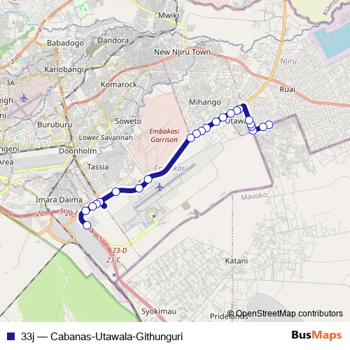See why over 2 million users trust and consider busmaps.com as the best public transport website. busmaps gives you Nairobi Buses suggested routes, real-time bus tracker, line route maps in Nairobi, and helps to find the closest 33j bus stops near you. No internet available? Download an offline PDF map and bus schedule for the 33j bus to take on your trip.