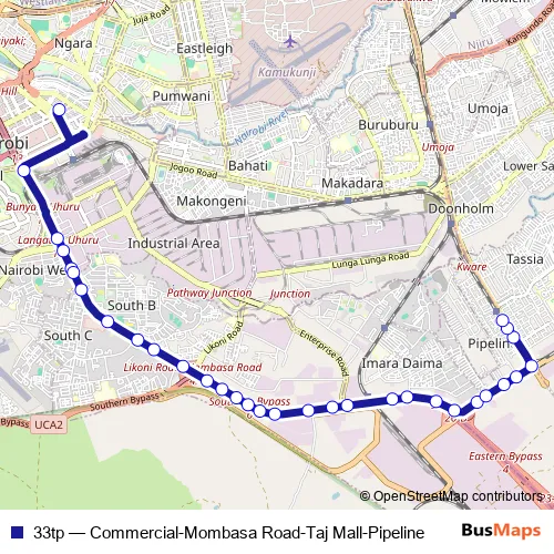 The first stop of the 33tp bus route is Commercial and the last stop is Pipeline. 33tp (Commercial-Mombasa Road-Taj Mall-Pipeline) is operational during everyday.