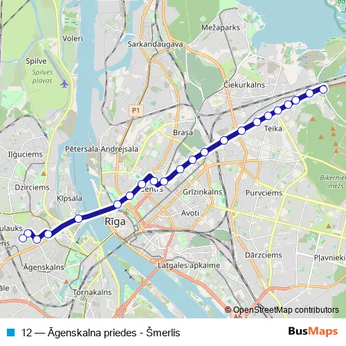 The first stop of the 12 trolleybus route is Šmerlis and the last stop is Āgenskalna priedes. 12 (Āgenskalna priedes - Šmerlis) is operational during on weekdays.