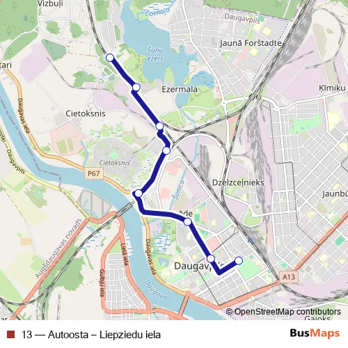 The first stop of the 13 bus route is Autoosta and the last stop is Liepziedu iela. 13 (Autoosta – Liepziedu iela) is operational during everyday.