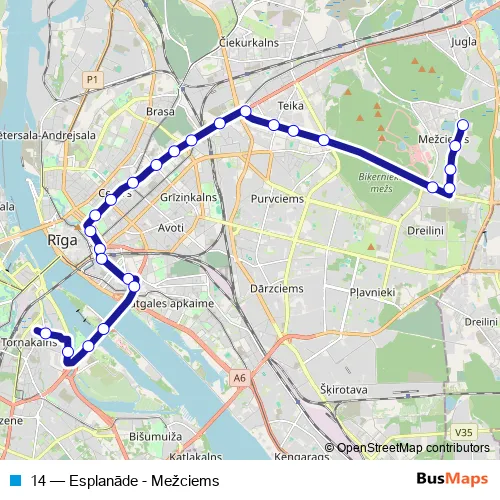 The first stop of the 14 trolleybus route is Mežciems and the last stop is Jelgavas iela. 14 (Esplanāde - Mežciems) is operational during everyday.