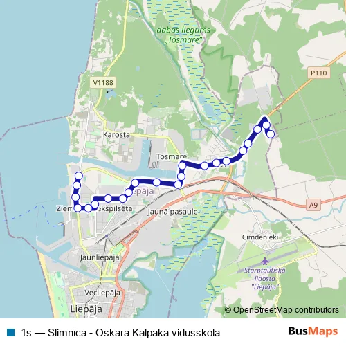 Bus 1s - Slimnīca - Oskara Kalpaka vidusskola Schedule in Liepaja