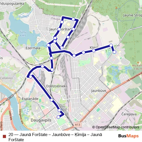 The first stop of the 20 bus route is Cialkovska iela and the last stop is Autoosta. 20 (Jaunā Forštate – Jaunbūve – Ķīmija – Jaunā Forštate) is operational during everyday.