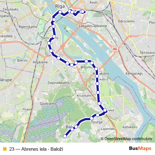 The first stop of the 23 bus route is Baložu galapunkts and the last stop is Abrenes iela. 23 (Abrenes iela - Baloži) is operational during everyday.