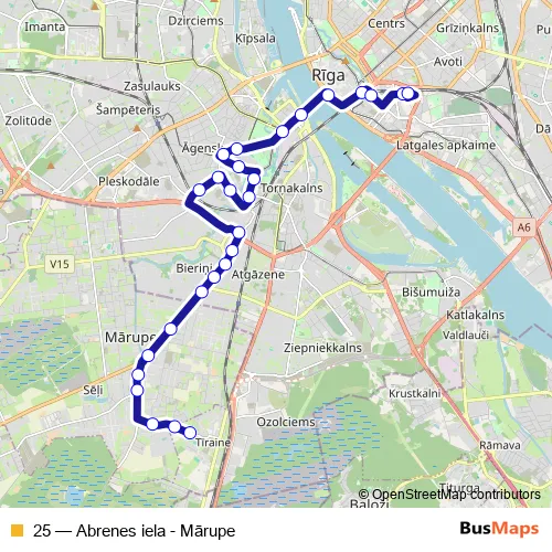 The first stop of the 25 bus route is Tīraine and the last stop is Abrenes iela. 25 (Abrenes iela - Mārupe) is operational during everyday.