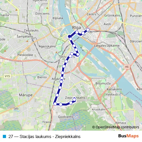The first stop of the 27 trolleybus route is Stacijas laukums and the last stop is Ziepniekkalna D/P. 27 (Stacijas laukums - Ziepniekkalns) is operational during everyday.