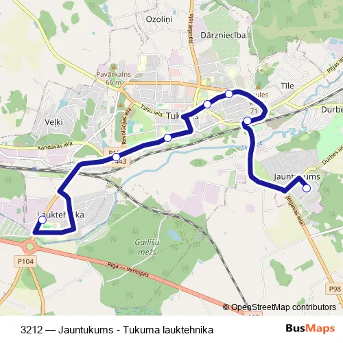 The first stop of the 3212 bus route is Tukuma lauktehnika and the last stop is Jauntukums. 3212 (Jauntukums - Tukuma lauktehnika) is operational during everyday.