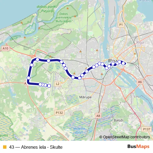 The first stop of the 43 bus route is Pilotu skola and the last stop is Abrenes iela. 43 (Abrenes iela - Skulte) is operational during everyday.