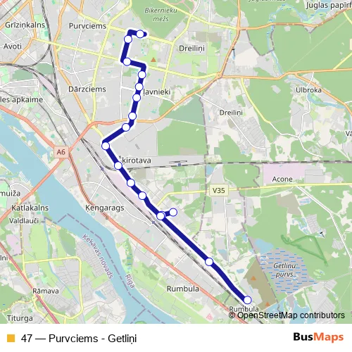 The first stop of the 47 bus route is Purvciems and the last stop is Getliņi. 47 (Purvciems - Getliņi) is operational during on weekdays.