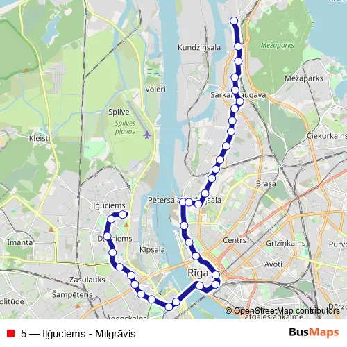 The first stop of the 5 tram route is Iļģuciems and the last stop is Mīlgrāvis. 5 (Iļģuciems - Mīlgrāvis) is operational during everyday.