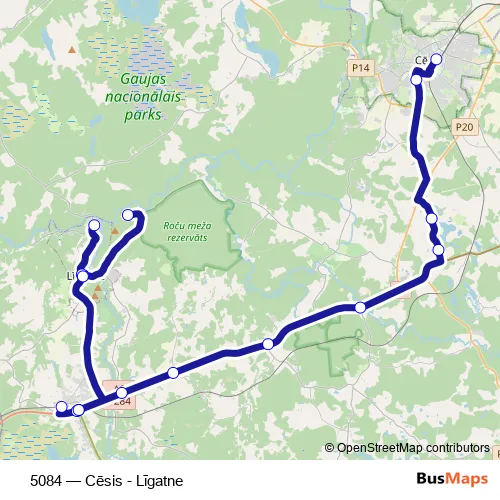 The first stop of the 5084 bus route is Cēsu Ao and the last stop is Augšlīgatne. 5084 (Cēsis - Līgatne) is operational during everyday.