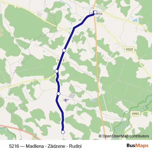The first stop of the 5216 bus route is Madliena and the last stop is Rudiņi. 5216 (Madliena - Zādzene - Rudiņi) is operational during on weekdays.