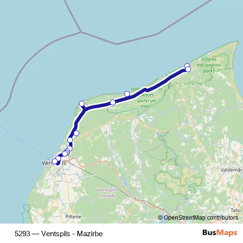 The first stop of the 5293 bus route is Mazirbes tautas nams and the last stop is Ventspils Ao. 5293 (Ventspils - Mazirbe) is operational during everyday.