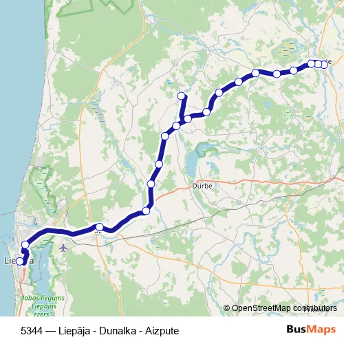 The first stop of the 5344 bus route is Aizpute and the last stop is Liepāja (Kuršu iela). 5344 (Liepāja - Dunalka - Aizpute) is operational during everyday.