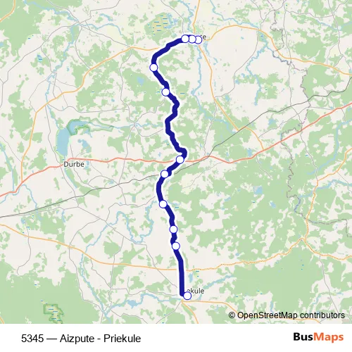 The first stop of the 5345 bus route is Aizpute and the last stop is Priekule. 5345 (Aizpute - Priekule) is operational during everyday.