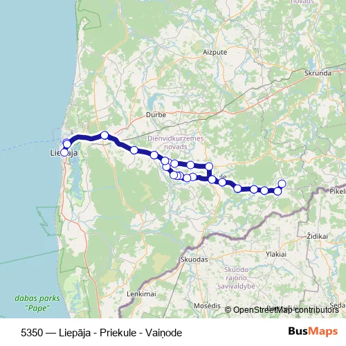 The first stop of the 5350 bus route is Vaiņode and the last stop is Liepāja (Kuršu iela). 5350 (Liepāja - Priekule - Vaiņode) is operational during everyday.