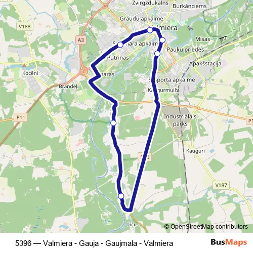 The first stop of the 5396 bus route is Valmieras Ao and the last stop is Valmieras Ao. 5396 (Valmiera - Gauja - Gaujmala - Valmiera) is operational during on weekends.