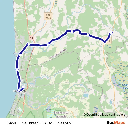 The first stop of the 5450 bus route is Vidriži and the last stop is Saulkrastu stacija. 5450 (Saulkrasti - Skulte - Lejasozoli) is operational during everyday.