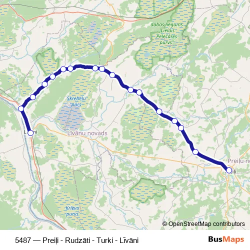 The first stop of the 5487 bus route is Preiļu Ao and the last stop is Līvāni. 5487 (Preiļi - Rudzāti - Turki - Līvāni) is operational during everyday.
