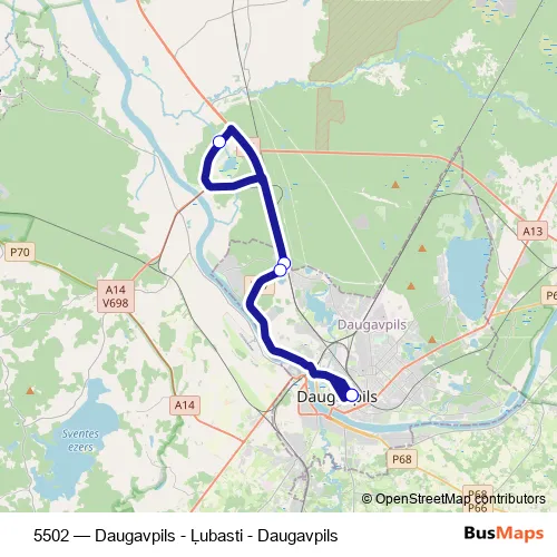 The first stop of the 5502 bus route is Daugavpils Ao and the last stop is Daugavpils Ao. 5502 (Daugavpils - Ļubasti - Daugavpils) is operational during on weekends.