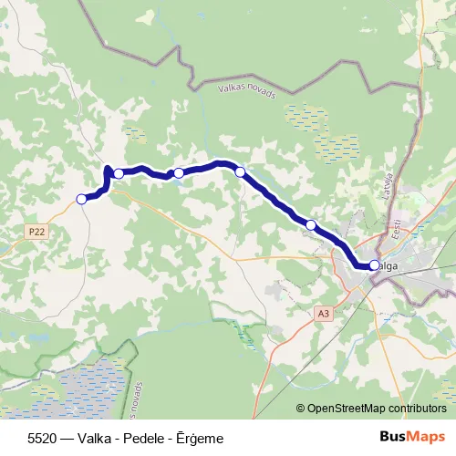 The first stop of the 5520 bus route is Ērģeme and the last stop is Valkas Ao. 5520 (Valka - Pedele - Ērģeme) is operational during everyday.